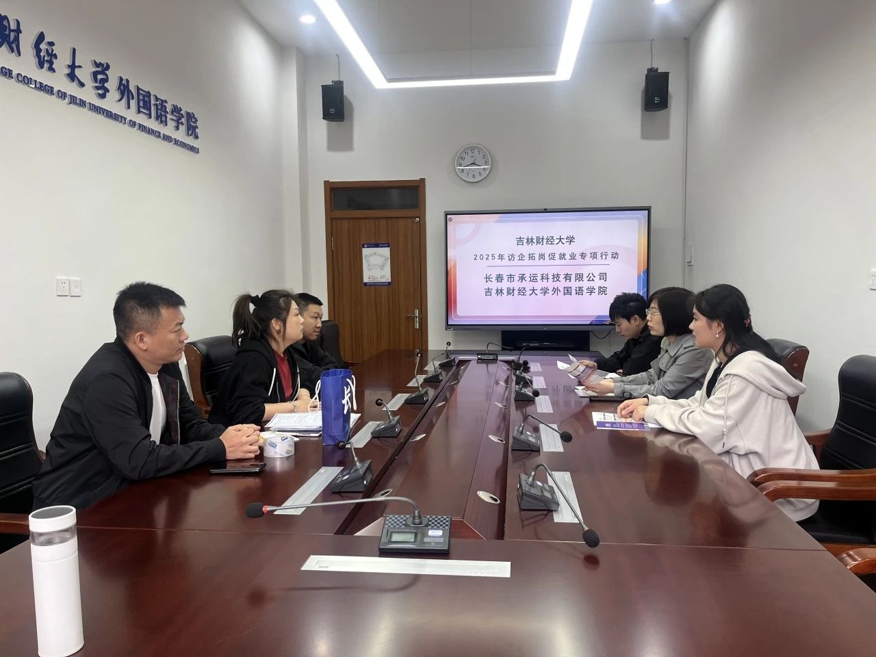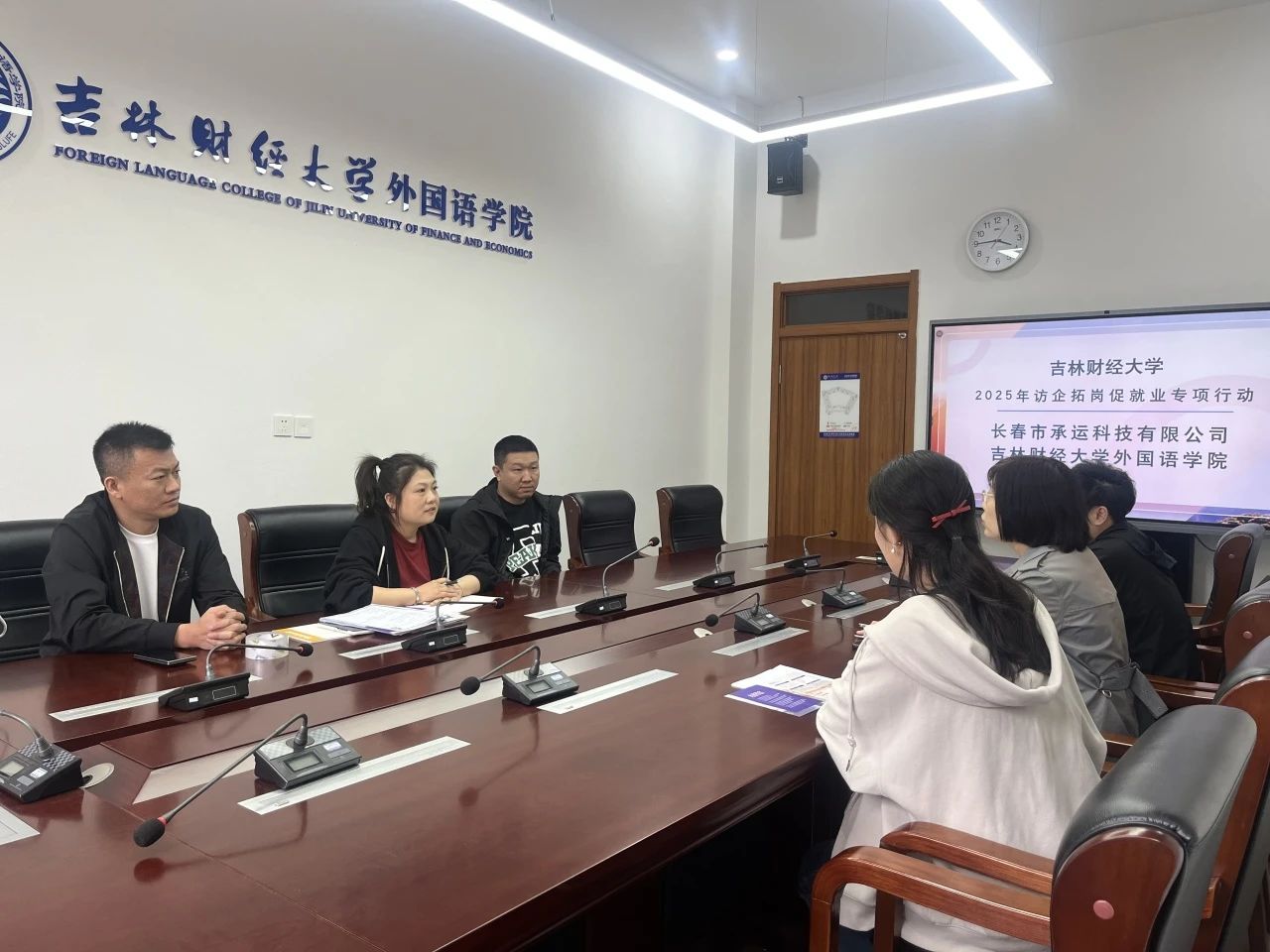 为深化产教融合,把握新媒体行业机遇,5月9日,长春市承运科技有限公司应学院邀请到我院开展访企拓岗交流活动,共商产教融合新方向。座谈会上,学院党总支副书记郭妍介绍了学院专业特色、人才培养模式及毕业生就业情况。她指出,学院始终注重实践教学与市场需求相结合,致力于培养具有国际视野和跨文化沟通能力的高素质外语人才。希望以此次交流为契机,与企业在跨境电商、外语直播等新兴领域展开深度合作,共同探索人才培养新路径,为学生提供更多实习与就业机会。长春市承运科技有限公司负责人详细介绍了公司的发展情况、业务范围及人才需求。