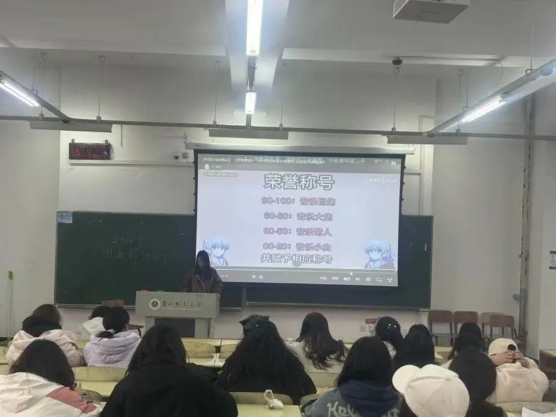 此次活动的歌曲曲库以红色主题歌曲为主。在活动过程中,指定人员负责播放音乐,从歌曲清单中随机选择一首歌曲,并播放一小段片段,在音乐播放的过程中,同学们认真倾听,识别出歌曲的名称、歌手以及其他相关信息,通过举手强答、轮流作答的方式参与互动。