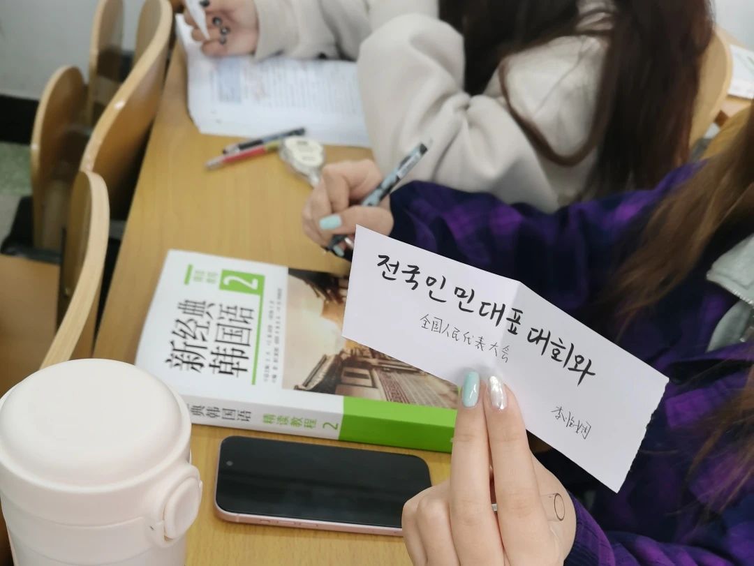 朝鲜语专业的同学通过读、写,推测出抽签内容,通过时政热点的关键词阅读翻译,从而了解到了国际局势的变化,学习了政务内容翻译的词汇选用,收获满满。