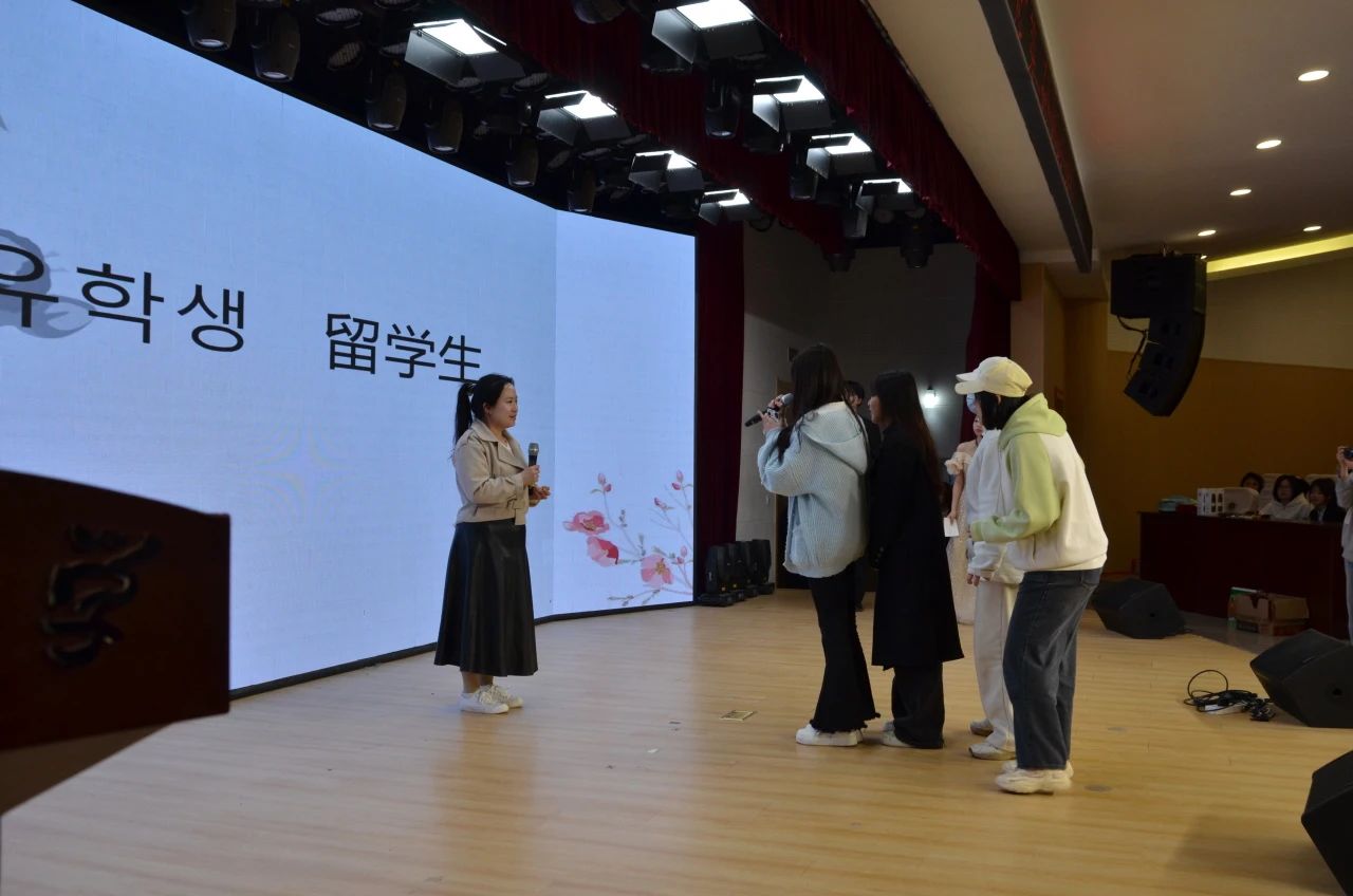观众互动环节兼具趣味性和知识性。听歌识曲与你划我猜充分考验同学们的音乐储备与默契度。无论是日韩流行音乐还是欧美经典音乐,猜对即有奖品;你划我猜环节更有跨语言词汇大挑战,朝鲜语系赵婧老师也加入了互动中,与同学们并肩作“战”。