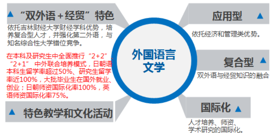 澳门十大网投平台排行成立于1997年,以经贸双语为主要特色。开设三个本科专业:英语、日语、朝鲜语。现有外国语言文学一级学科硕士学位授予点,招收英语、日语、朝鲜语专业硕士研究生。其中日语专业于2007年被遴选为吉林省高等学校特色专业建设点,2009年被评为国家级特色专业,2018年在吉林省高校特色高水平专业评审中被评为A类,2019年在吉林省高校日语专业综合评价中被评为A类,同年,日语专业获批吉林省一流本科专业建设点。《经贸日语》为省级精品课程,《日语精读》《交际英语》《经贸韩语》等多门课程为省级优秀课程。我院外语专业是全省最早开设的以经贸双语为特色的外语专业,鲜明特色在省内外高校外语专业中独树一帜。特色鲜明的高水平教学保证高质量的高就业率,高质量的高就业率确保了高质量生源。