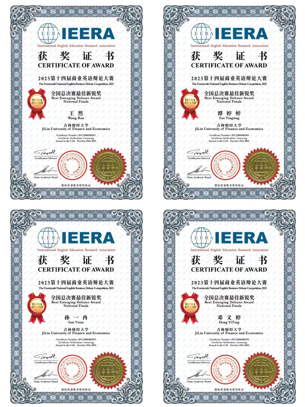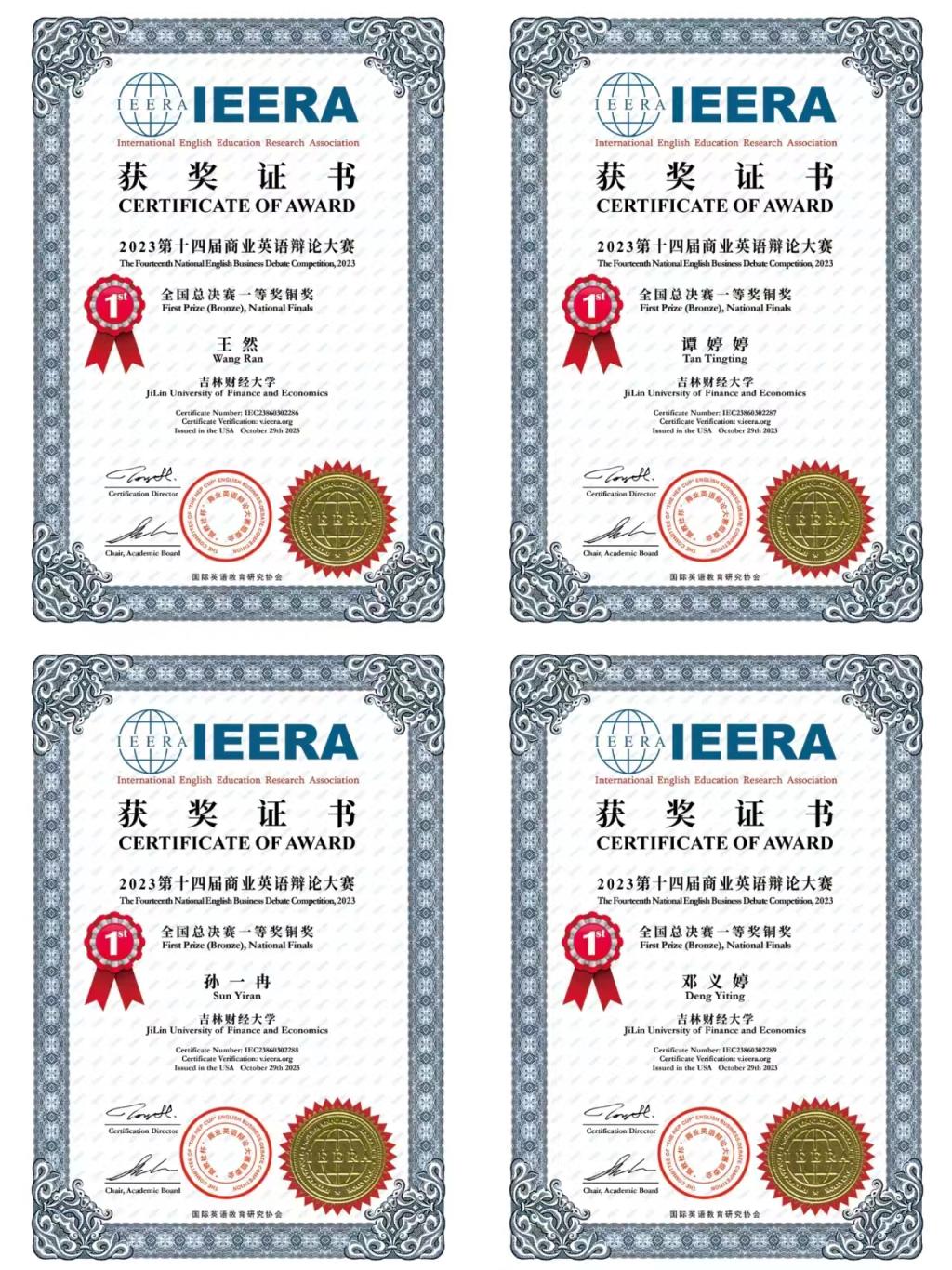 近日,第十四届“高教社杯”商业英语辩论大赛暨2023年全国高校创新创业系列赛总决赛落下帷幕。我院英语系王晓东老师率队带领王然、谭婷婷、孙一冉及邓义婷四位同学在本届大赛中获得全国总决赛一等奖铜奖和最佳新锐奖。