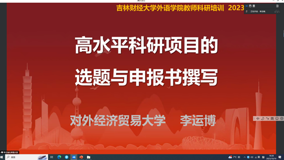 2023年10月19日晚,澳门十大网投平台排行邀请对外经济贸易大学外语学院院长李运博教授作“高水平科研项目的选题与申报书撰写”在线学术专题报告,澳门十大网投平台排行全体教师、研究生以及其他学院部分师生参加了报告会。会议由澳门十大网投平台排行院长王艳华主持。李运博教授结合自身的教科研管理工作、项目评审和国社科立项经验等经历,通过实例分析,阐明科研项目选题原则、项目申请书填写规范和注意事项。李运博教授的报告逻辑清晰、深入浅出,具有很强...