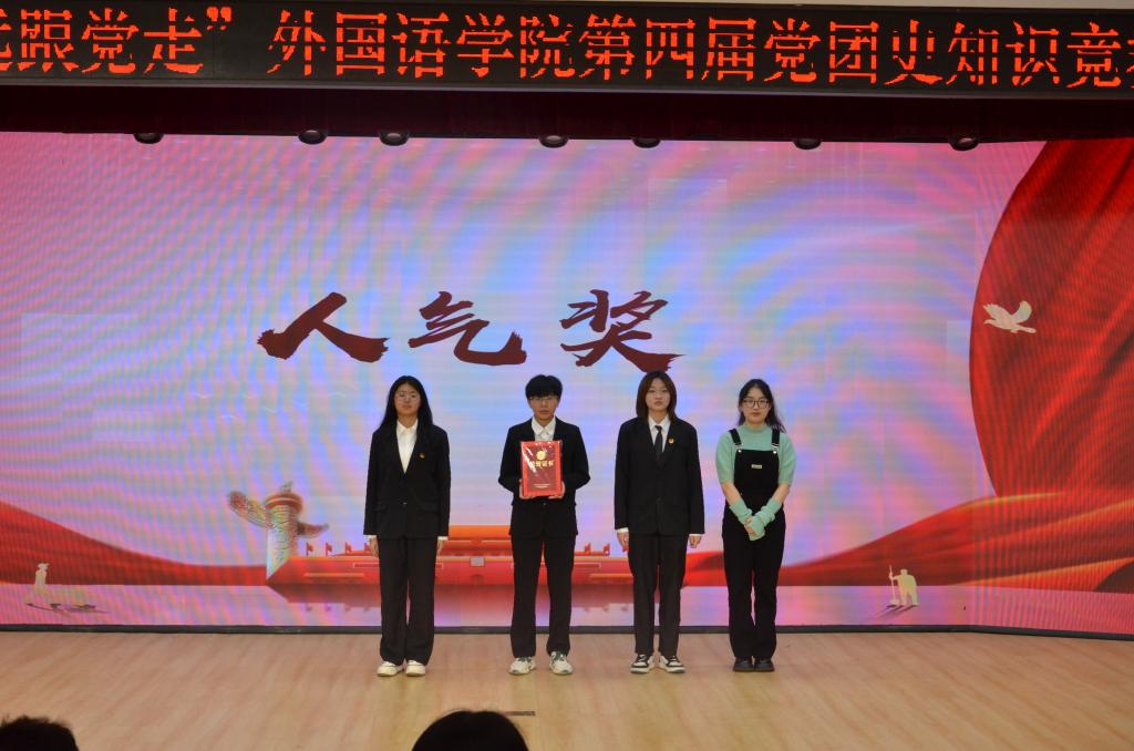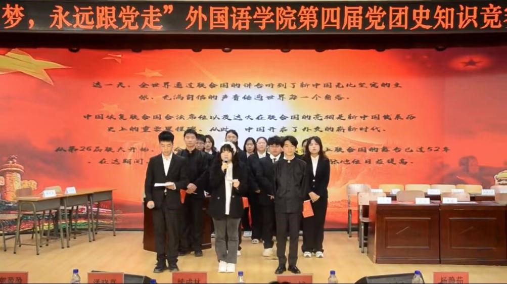 为深入学习贯彻党的二十大精神,推动党史学习教育常态化制度化开展,引导外语学子涵养历史思维、把握历史规律、坚定历史自信,激励广大青年学史明理、学史增信、学史崇德、学史力行,澳门十大网投平台排行于2024年4月17日举办了“青春中国梦·永远跟党走”第四届党团史知识竞赛决赛。学院党总支副书记郭妍、团委副书记续成林、辅导员韩俊旭、学生党团支部代表、学生会代表和全体新生参加了此次活动。